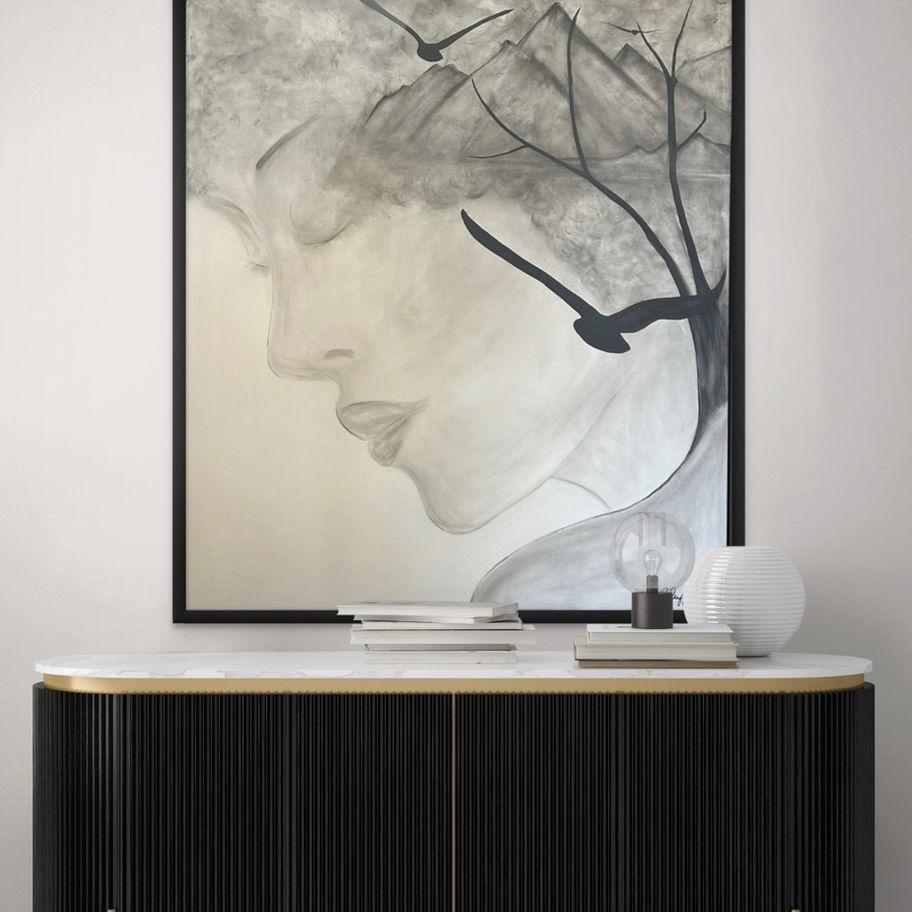 48x60" fully framed Experience the emotive journey of "Finding Peace," an original artwork by renowned South Florida artist Bonnie J. Ruffin. This captivating piece beautifully illustrates a woman's head merging seamlessly with a tranquil mountain view, symbolizing the harmony found in resilience and self-discovery. Bonnie's unique ability to transform pain into powerful visual narratives is masterfully showcased, making this artwork not only a stunning addition to any collection but also a testament to the strength of the human spirit. Explore the transformative power of art and uncover the serenity within "Finding Peace."